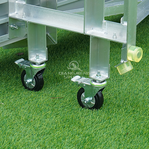 The movable bleacher uses L-shaped aluminum profiles made of 6063-T5 material with a thickness of 5mm, welded into the bottom frame. The seat boards are made from 1-3/4" × 9-1/2" size 6061-T6 aluminum alloy extrusion. The foot panels can be selected from 2 to 3 pieces of 1" × 6" 6061-T6 aluminum alloy extrusion small foot panels or 1 to 2 pieces of 1-3/4" × 9-1/2" 6061-T6 aluminum alloy extrusion large foot panels. The end caps are connected by blind rivets. The surfaces of the seat board, foot panels, and end cap are all treated with anodic oxidation process. The rear is equipped with 4-inch diameter universal dual-brake caster wheels made of polyurethane, and the base is equipped with polyurethane pads that can easily tilt the bleacher to an upright position. After use, only push the bleacher to its storage site to save space.
