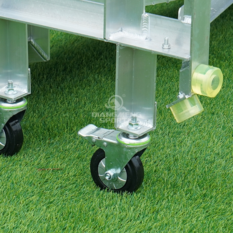 The movable bleacher uses L-shaped aluminum profiles made of 6063-T5 material with a thickness of 5mm, welded into the bottom frame. The seat boards are made from 1-3/4" × 9-1/2" size 6061-T6 aluminum alloy extrusion. The foot panels can be selected from 2 to 3 pieces of 1" × 6" 6061-T6 aluminum alloy extrusion small foot panels or 1 to 2 pieces of 1-3/4" × 9-1/2" 6061-T6 aluminum alloy extrusion large foot panels. The end caps are connected by blind rivets. The surfaces of the seat board, foot panels, and end cap are all treated with anodic oxidation process. The rear is equipped with 4-inch diameter universal dual-brake caster wheels made of polyurethane, and the base is equipped with polyurethane pads that can easily tilt the bleacher to an upright position. After use, only push the bleacher to its storage site to save space.